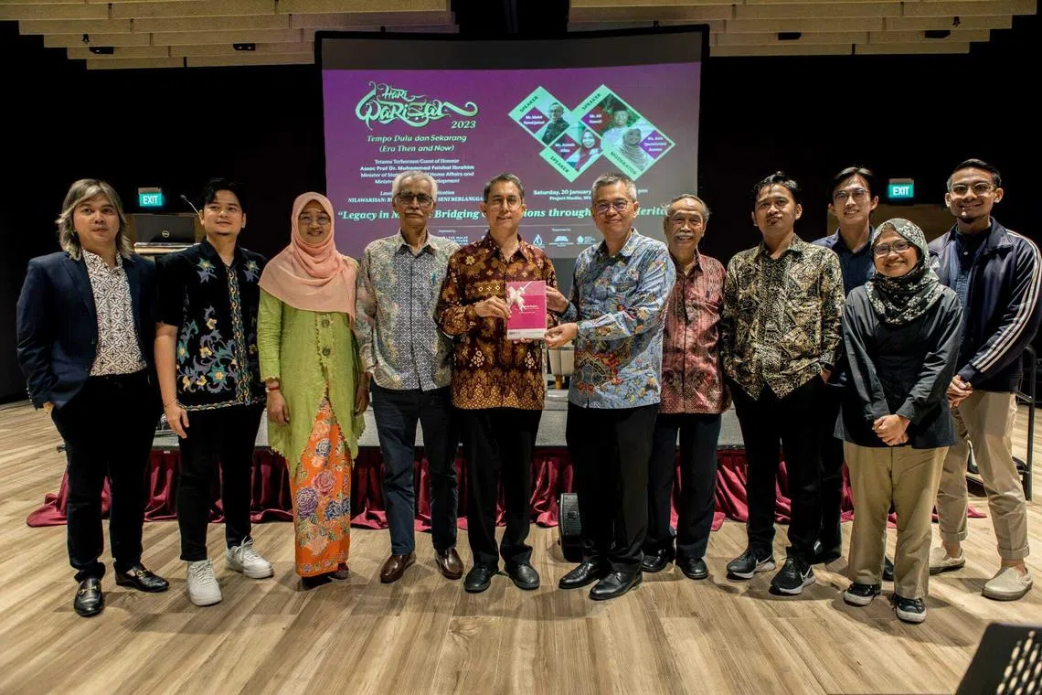 (Dari kiri) Naib presiden Yayasan Warisan Melayu (MHF) Dr Azhar Ibrahim; penulis, Encik Wan Khuzairey; naib pengerusi MHF, Cik Rahayu Buang; sasterawan tempatan, Encik Hamed Ismail; Menteri Negara (Ehwal Dalam Negeri merangkap Pembangunan Negara), Profesor Madya Dr Muhammad Faishal Ibrahim; pengerusi MHF, Dr Norshahril Saat; mantan anggota Parlimen, Encik Yatiman Yusof; dan penulis, Encik Ahalla Tsauro; Encik Ahmad Ubaidillah; Cik Suraya Suhairi; dan Encik Mohamad Tauhid bergambar bersama di majlis pelancaran buku kompilasi esei ‘Nilawarisan: Budaya, Bahasa, Sastera dan Seni Berlanggam’ pada 20 Januari. - Foto MHF