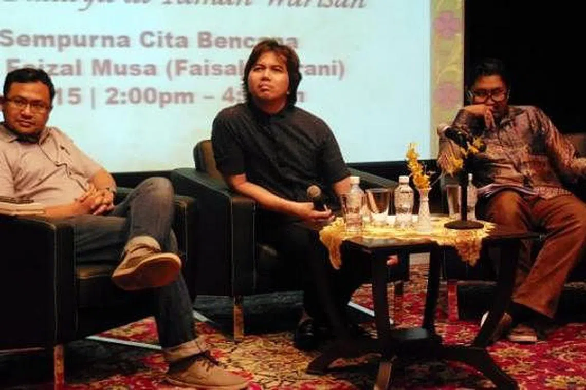 FORUM: (Dari kiri) Encik Mohamed Imran Mohamed Taib, Dr Azhar Ibrahim dan Dr Mohd Faizal Musa@Faisal Tehrani berbincang di Taman Warisan Melayu, 9 Mei lalu. - Foto MOHD RAMAN DAUD -