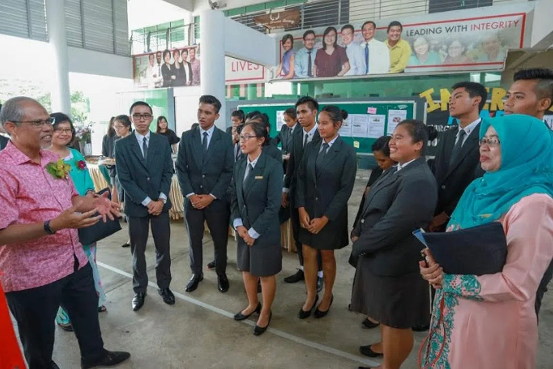 PENTINGNYA DWIBAHASA: Encik Masagos Zulkifli Masagos Mohamad (paling kiri) menekankan pentingnya pelajar fasih berkomunikasi dalam kededua bahasa Melayu dan Inggeris selain mengetahui tentang budaya Melayu agar dapat meraih peluang pekerjaan di negara-negara jiran. - Foto BH oleh IQBAL FAIZAL -
