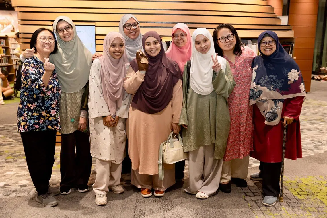 Cik Juriah Atan (kiri) dan Cik Jumaini Ariff (kanan) bergambar bersama tujuh peserta sesi bimbingan dan bengkel bercerita anjuran Persatuan Penceritaan Singapura (SAS) iaitu (dari dua dari kiri) Cik Nur Ziehan Jalil, Cik Wathiqah Abdul Malek, Cik Siti Kamirah Mohamed Nor, Cik Nur Haishah Shalong, Cik Khadijatul Kubra Mohd Harun, Cik Noor Hidayah Sheikh Omar dan Cik Norhaiyah Mahmood. - Foto SAS