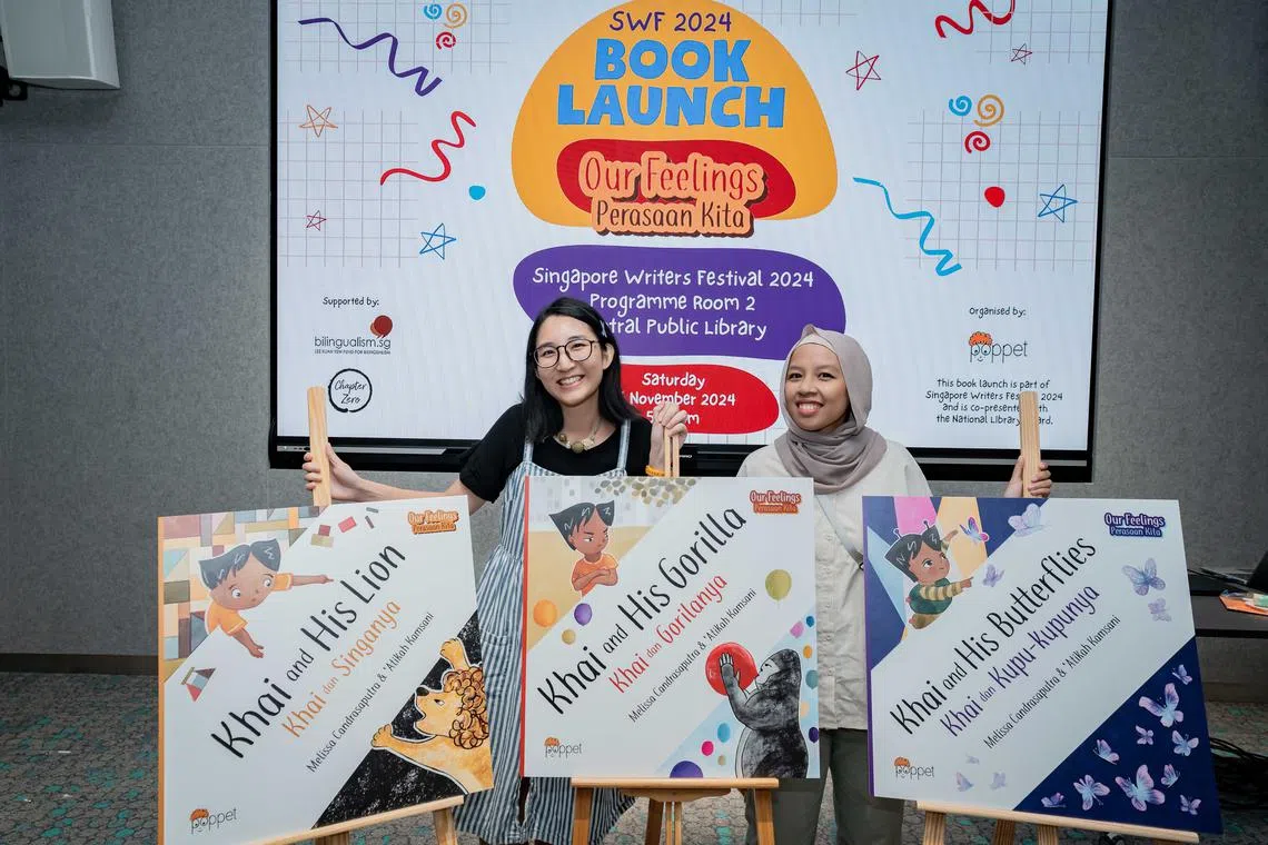 Penulis siri buku dwibahasa, ‘Our Feelings/Perasaan Kita’, Atikah Kamsani (kanan) dan Melissa Candrasaputra, di pelancaran buku mereka di Bangunan Perpustakaan Negara pada 16 November. Mereka berharap buku mereka dapat menjadi panduan bukan sahaja kepada kanak-kanak, bahkan ibu bapa mengenai memahami dan mengawal emosi. - Foto POPPET’S WORLD