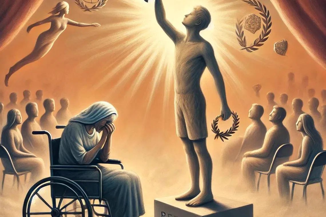 Gambaran seorang pemuda menjulang pengiktirafan di atas pengorbanan orang lain. - Foto hasil Kecerdasan Buatan (AI)