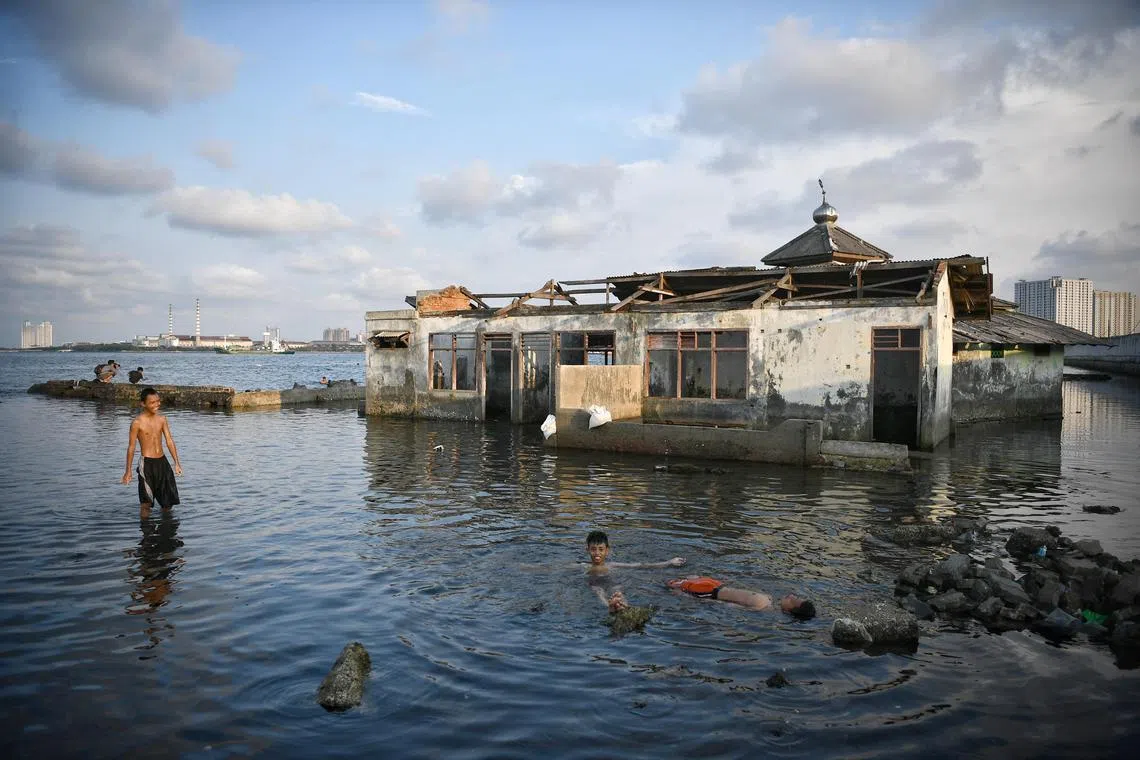 KESAN PEMANASAN GLOBAL: Kanak-kanak bermain di sekitar sebuah masjid yang ditinggalkan di Muara Baru, utara Jakarta, yang semakin mendak dan tenggelam gara-gara paras laut semakin tinggi dek pemanasan global dan penggunaan berlebihan air bawah tanah. - Foto fail