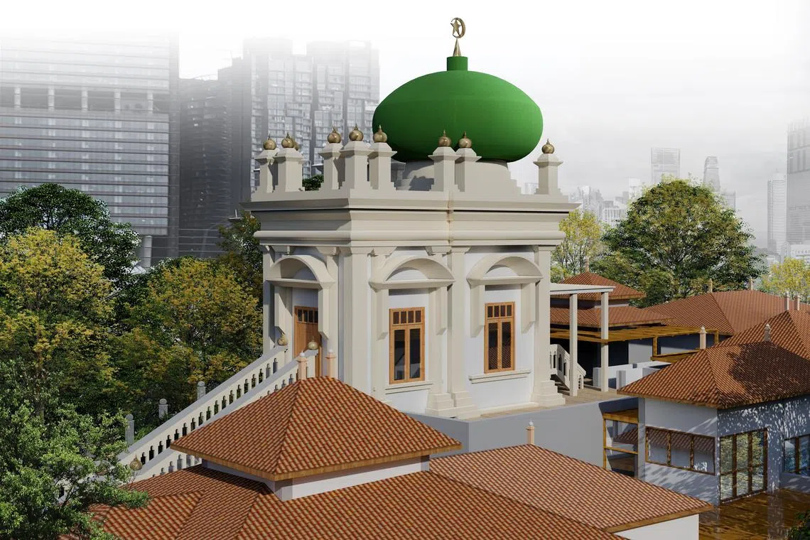 “Sekarang ini, muka hadapan bangunan, atau facade, kubah makam berbentuk mozek. Setelah siap, struktur ini akan kembali kepada wajah asal seperti sebelum ini, yang pernah berasaskan cat supaya ia lebih senang diurus,” jelas Encik Khalid.