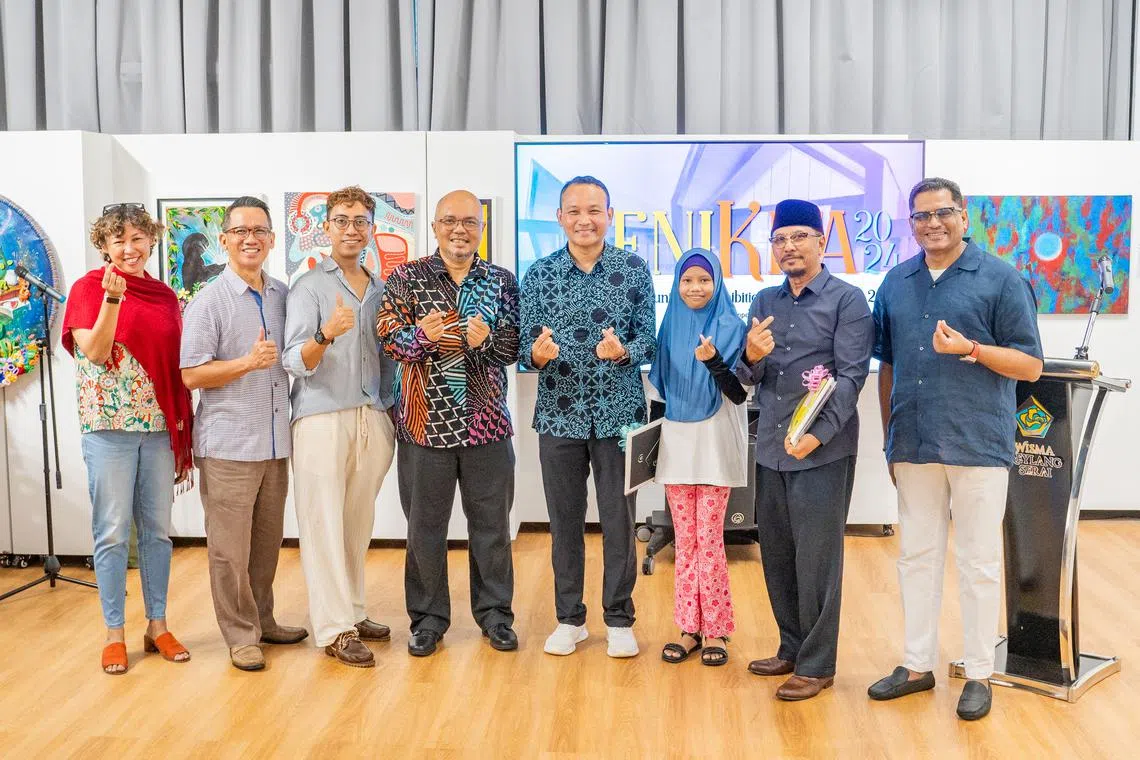(Dari kiri) Pengurus Kamal Art, Cik Eliyah Osman; Pengurus Besar Wisma Geylang Serai (WGS), Encik Mokhtar Jaffar; Naib Johan Karya Terbaik, Muhd Mitaq; pengasas Kamal Arts Limited, Encik Kamal Dollah; Mayor Majlis Pembangunan Masyarakat (CDC) South East, Encik Mohd Fahmi Aliman; pemenang Anugerah Artis Harapan, Liya Amira; pemenang Karya Terbaik, Saiman Ismail; dan Penolong Pengarah Jabatan Daerah Jalur Budaya Geylang Serai, Encik Hajah Mohaideen Kamal Batcha, di pameran SeniKita di Wisma Geylang Serai (WGS) pada 16 November. - Foto WGS