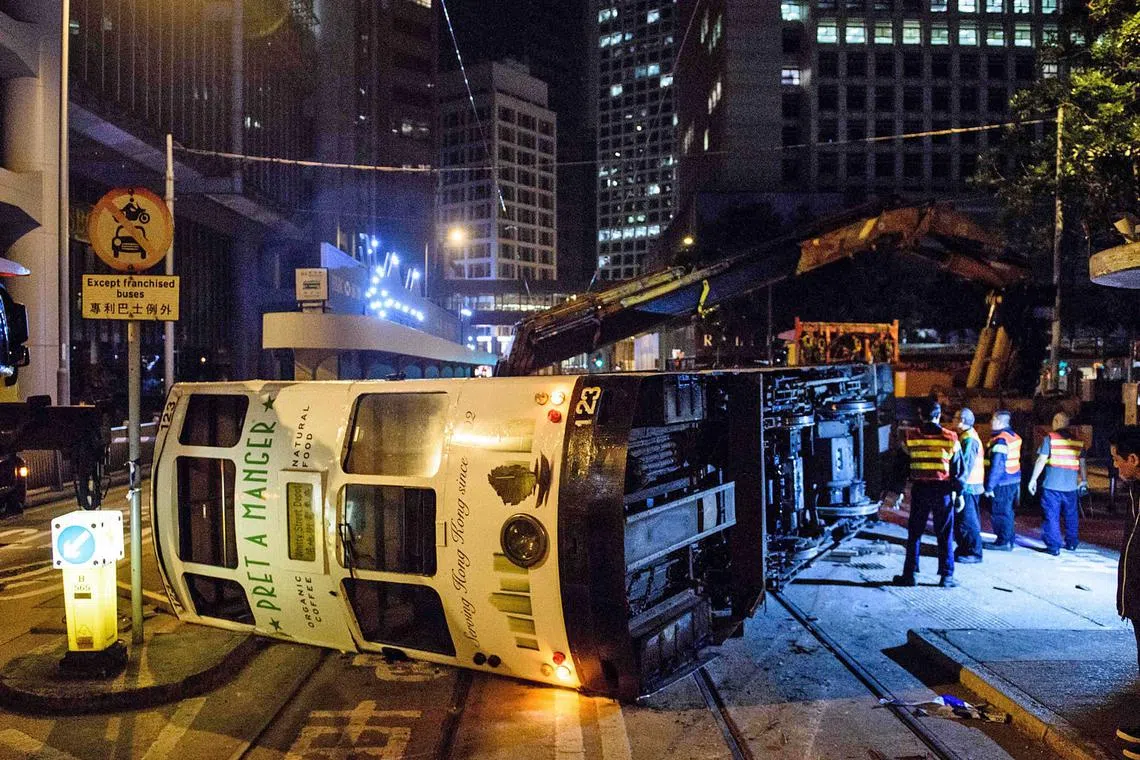 HONGKONG: Seramai 11 orang cedera selepas sebuah trem dua tingkat terbalik di sini, dalam kejadian yang disifatkan pihak berkuasa sebagai jarang berlaku membabitkan rangkaian pengangkutan awam di bandar ini.