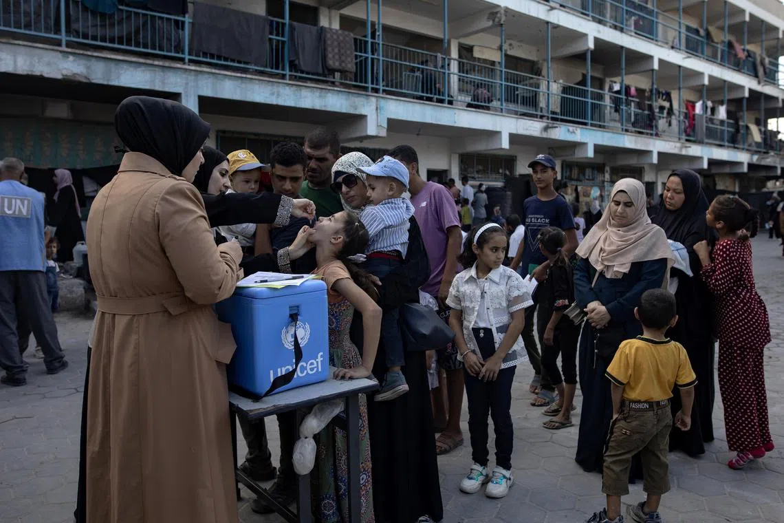 KAHIRAH/GAZA: Rakyat Palestin berbondong-bondong ke pusat perubatan di selatan Jaluran Gaza untuk memastikan anak-anak mereka diberi vaksin polio dalam fasa kedua kempen yang setakat ini memanfaatkan 187,000 kanak-kanak.