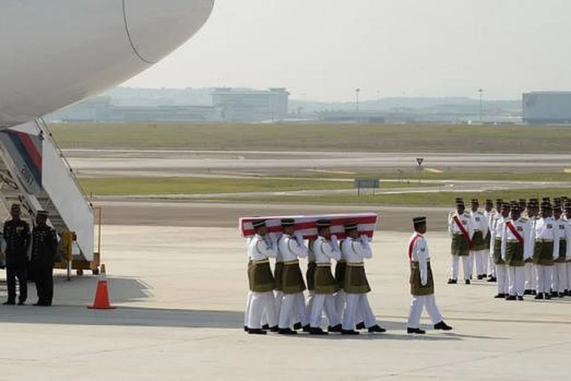 ISTIADAT PENGHORMATAN: Anggota Rejimen Askar Melayu Diraja memberi penghormatan sebelum mengusung keranda mangsa nahas pesawat Malaysia Airlines ketika 'Istiadat Penghormatan Jenazah Tragedi MH17' berlangsung di Lapangan Terbang Antarabangsa Kuala Lumpur. - Foto AFP -
