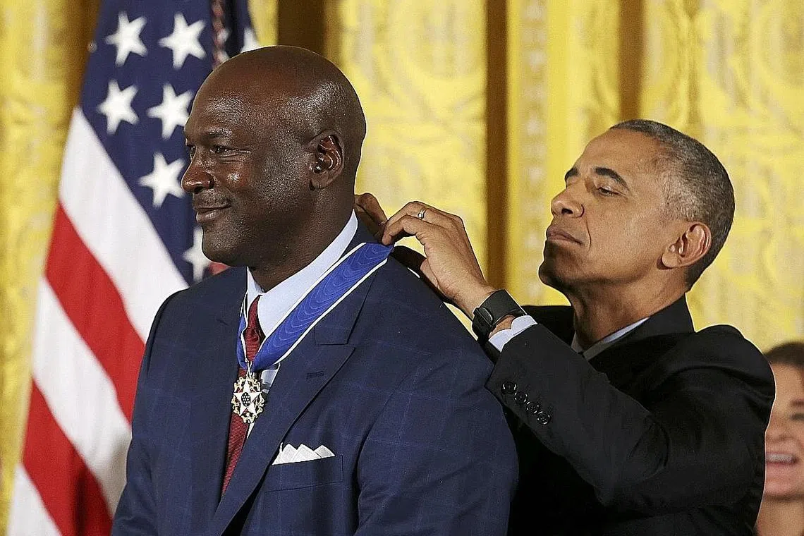 ANUGERAH TERTINGGI: Bintang bola keranjang Michael Jordan (kiri) antara tokoh Amerika yang menerima Pingat Presiden Amerika bagi Kebebasan daripada Presiden Obama semalam. - Foto REUTERS -