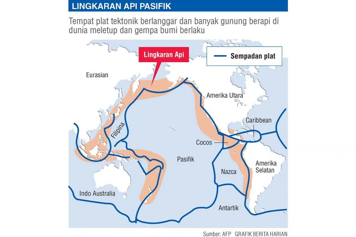 PUNCA GEMPA BUMI: Di kawasan Lingkaran Api terdapat sempadan plat-plat tektonik Bumi, iaitu tempat plat tektonik bertemu. Apabila plat tektonik tergesel, bahagian yang tergesel tersangkut pada satu sama lain. Tekanan terbina di kawasan tersangkut itu kerana bahagian lain terus bergerak. Tekanan itu akhirnya menyebabkan batuan di bahagian tersangkut pecah atau tergelincir, membuat plat terbabit terentap dengan kuat hingga mencetuskan gempa bumi. -