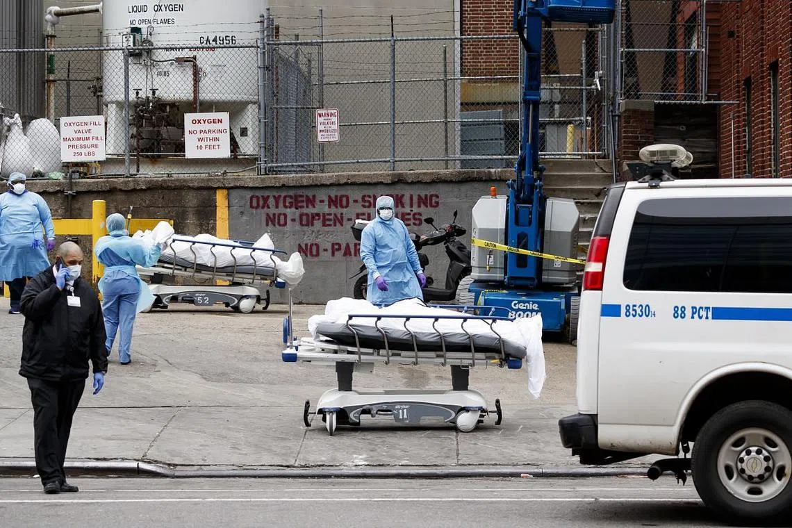 JUMLAH KEMATIAN MENINGKAT: Kakitangan perubatan bersama mayat-mayat yang bakal disimpan buat sementara waktu di rumah mayat mudah alih di luar Pusat Hospital Brooklyn, New York. Rumah mayat mudah alih diperlukan dek kesuntukan tempat di hospital. New York merupakan pusat wabak Covid-19 di AS. - Foto EPA-EFE -