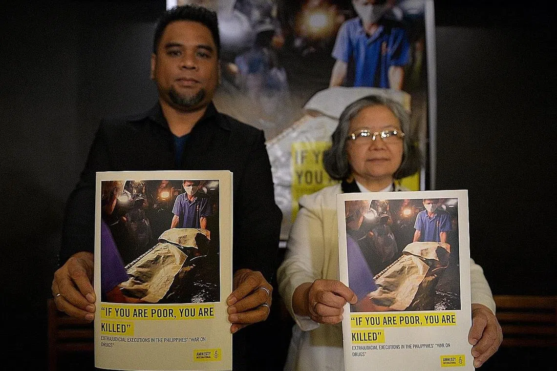 BENTANGKAN LAPORAN: Encik Wilnor Papa dan Sister Maria Cordero, daripada Amnesty International bersama salinan laporan mereka yang menunjukkan gambar mayat pesalah dadah yang ditembak mati pihak polis. - Foto AFP -