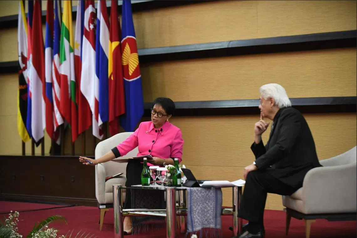DIALOG TERBUKA: Menteri Luar Indonesia, Cik Retno Marsudi (kiri), bersama moderator, Encik Pichai Chuensuksawadi (kanan), Ketua Editor Kumpulan dan Editor Bangkok Post, dalam Forum Media Asean ketujuh yang diadakan di Jakarta baru-baru ini. - Foto SEKRETARIAT ASEAN