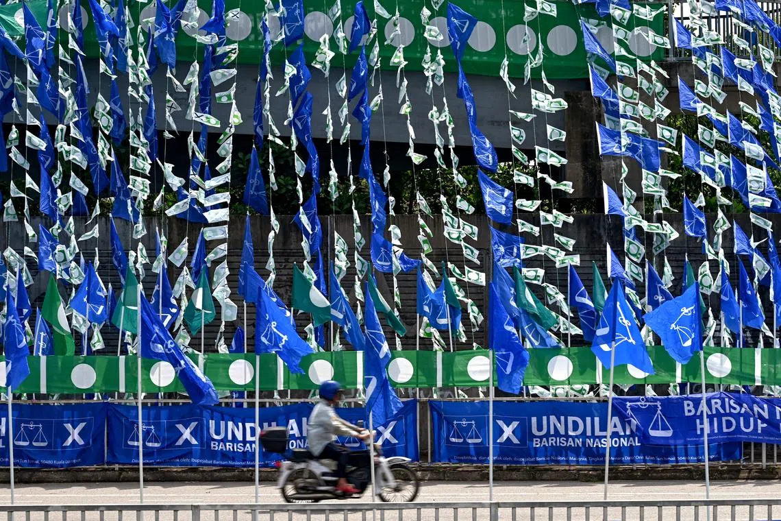 KIAN RANCAK: Seorang penunggang motosikal berlalu di depan deretan bendera Barisan Nasional (biru) dan bendera Parti Islam SeMalaysia yang digantung di jejantas di Kampung Bukit Guntung, Kuala Terengganu. - Foto BERNAMA