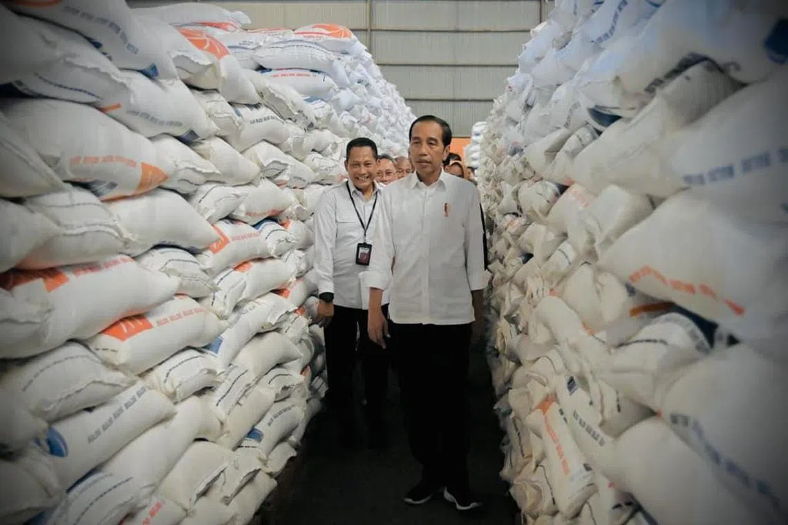 BERAS MENCUKUPI: Presiden Indonesia, Encik Joko Widodo meninjau bekalan beras di Gudang Bulog DKI Jakarta-Banten pada Isnin bagi memastikan ia mencukupi untuk menampung permintaan dalam negeri walaupun terdapat sekatan eksport dari beberapa negara pengeluar. - Foto FACEBOOK JOKO WIDODO