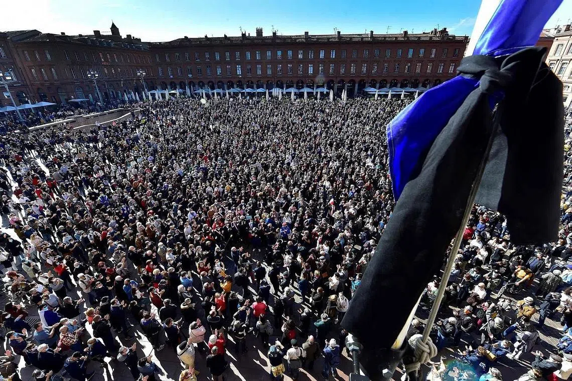 BERHIMPUN TANDA PERPADUAN: Ribuan orang membanjiri Place du Capitole di Toulouse kelmarin memberi penghormatan kepada guru sejarah Samuel Paty yang dibunuh. - Foto AFP -