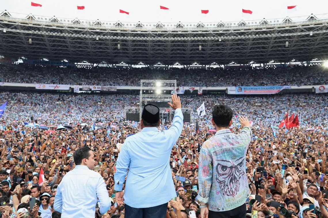 Ketika perhimpunan Anies-Muhaimin berakhir pada tengah hari, perhimpunan Encik Prabowo dan pasangannya, yang juga anak Presiden Joko Widodo, Encik Gibran Rakabuming Raka bermula di Stadium Gelora Bung Karno di Jakarta Pusat.