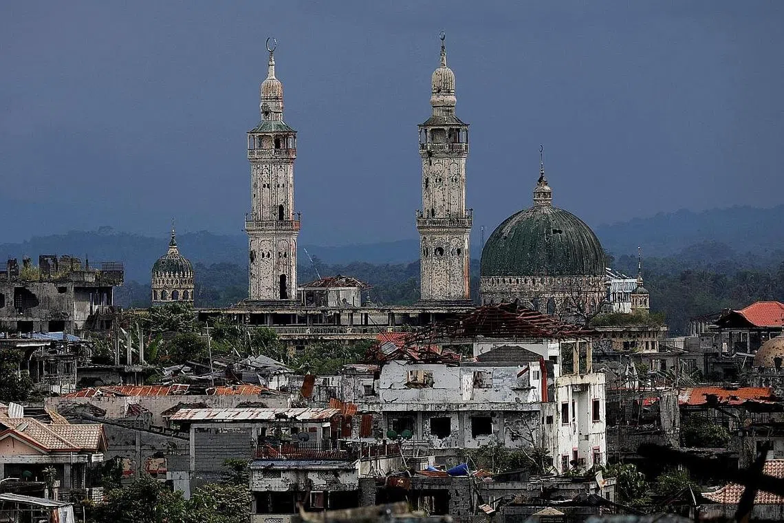 MASIH PERLU DIBANGUNKAN: Keadaan bandar Marawi lewat tahun lalu menunjukkan banyak bangunan yang kelihatan masih rosak dan perlu diperbaiki. Ribuan penduduk bandar itu masih tidak dibenarkan pulang ke rumah masing-masing dan masih tinggal di tempat perlindungan sementara. - Foto REUTERS -