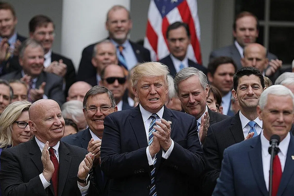 RAI KEJAYAAN: Encik Donald Trump (tengah) berhimpun bersama Naib Presiden Mike Pence (kanan) dan anggota Kongres dari parti Republikan di Taman Ros, Rumah Putih selepas Dewan Perwakilan meluluskan langkah mansuhkan Obamacare. - Foto REUTERS -