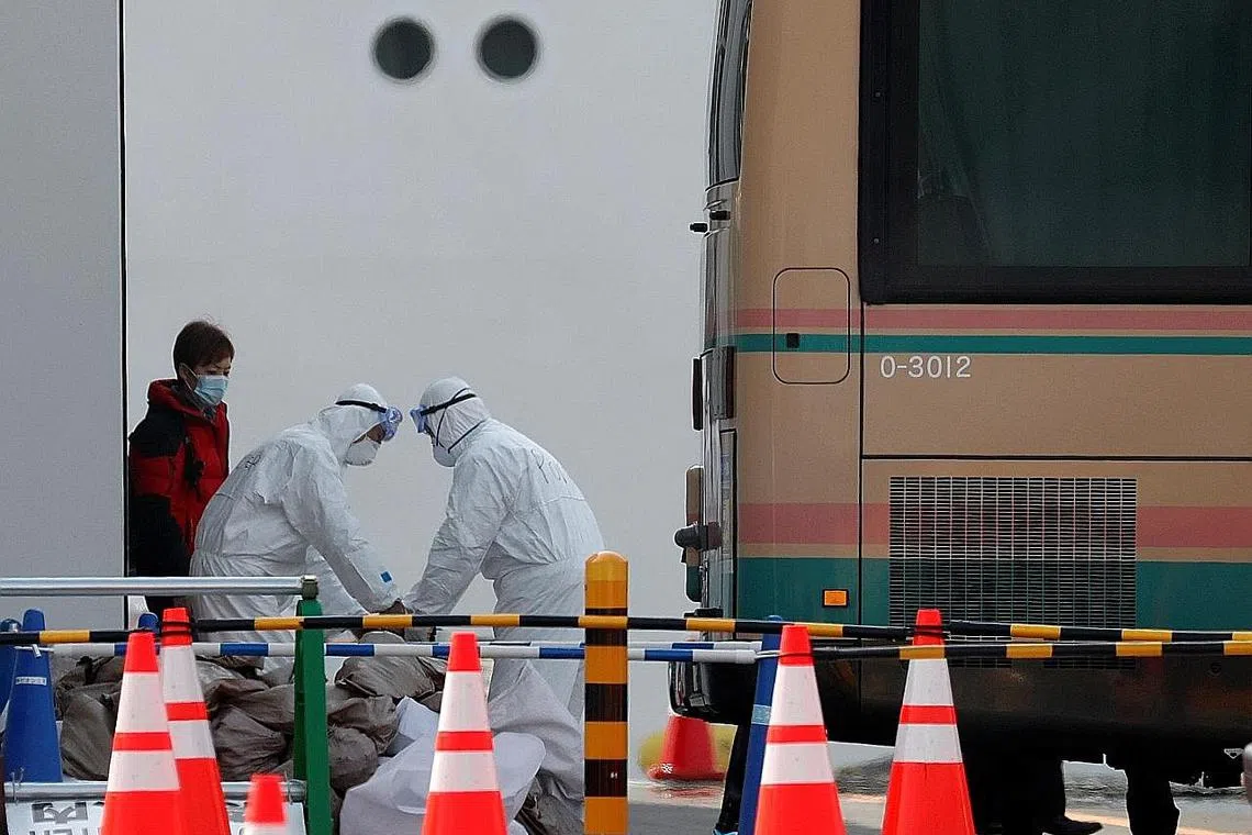 PINDAHKAN PENUMPANG: Pekerja yang mengenakan peralatan perlindungan membantu menaikkan bagasi penumpang ke dalam bas selepas penumpang meninggalkan kapal persiaran Diamond Princess yang berlabuh di Pelabuhan Yokohama, selatan Tokyo, Jepun. - Foto REUTERS -