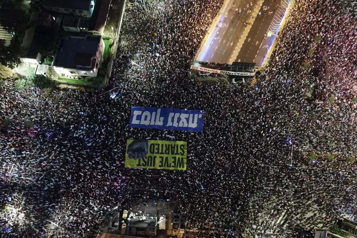 Penunjuk perasaan membawa sepanduk bertulis ‘Selamatkan demokrasi!’, ‘Kebebasan untuk semua!’ dan ‘Netanyahu membawa kita kepada peperangan.’