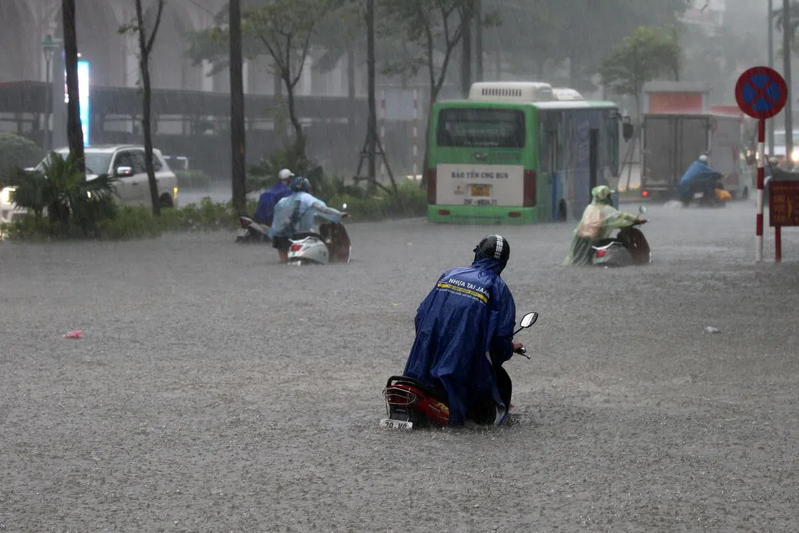 Di ibu negara Hanoi, hujan berterusan disertai guruh dan kilat menyebabkan jalan utama tenggelam dan lalu lintas lumpuh. Banyak kawasan kediaman turut dinaiki air sehingga mengganggu aktiviti harian penduduk.