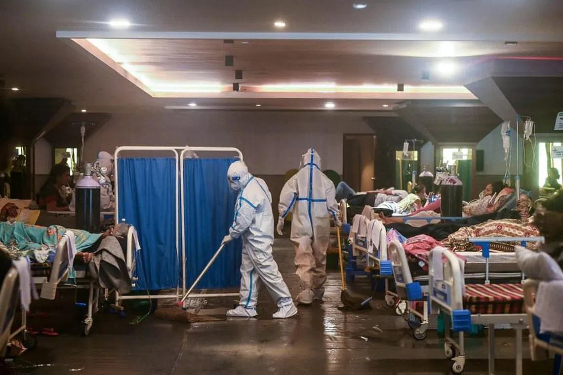 Seorang pekerja kesihatan membersihkan lantai di sebuah wad sementara Covid-19 di New Delhi pada 1 Mei 2021. - - Foto AFP