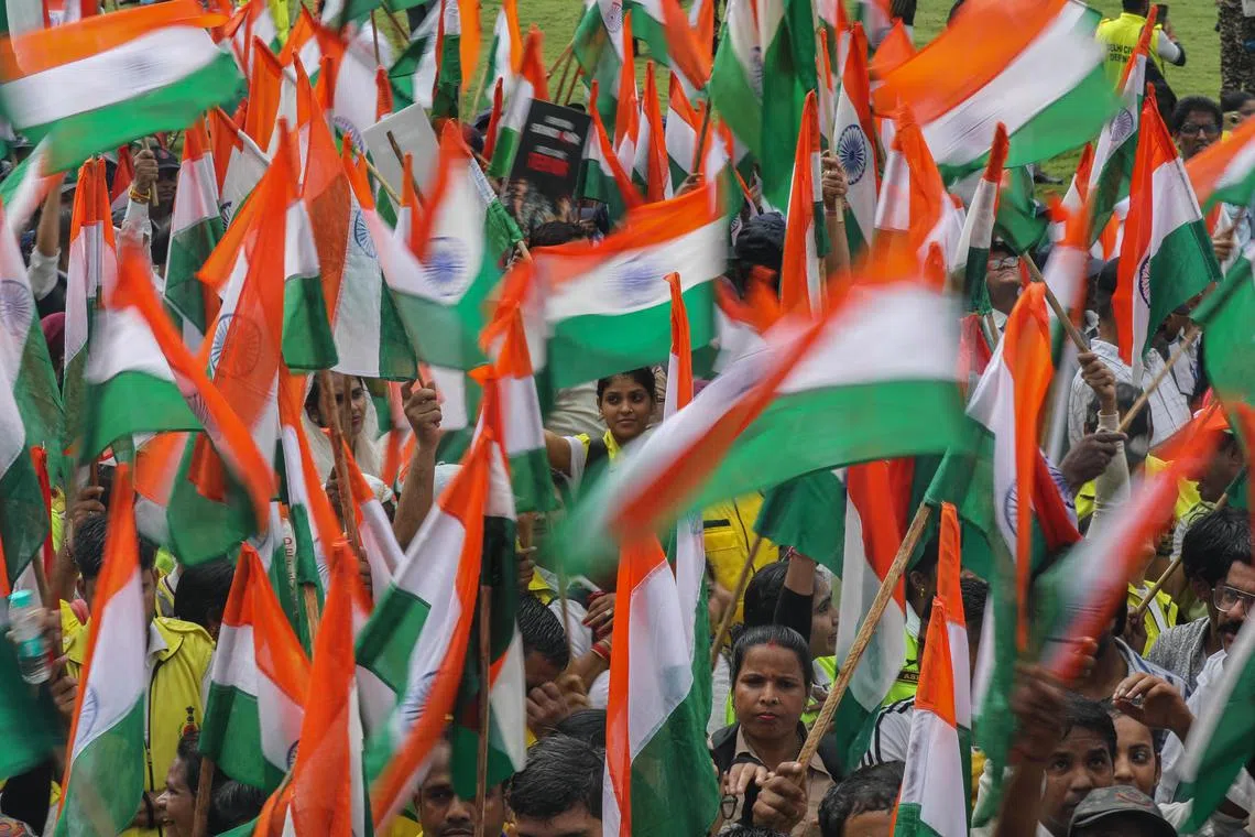 Rakyat India menyertai perbarisan dengan mengibarkan bendera negara sebagai menyokong operasi ketenteraan dan keberanian Angkatan Tentera India di New Delhi pada 13 Mei. - Foto EPA-EFE