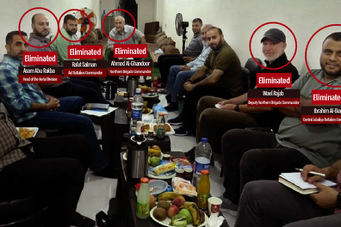 Sayap tentera Hamas, Briged al-Qassam, mengesahkan bulan lalu bahawa sekurang-kurangnya tiga lelaki dalam gambar itu telah terbunuh, termasuk Encik Ahmed al-Ghandour, pemimpin tentera utara Gaza yang dikenali sebagai Abu Anas, dan timbalannya, Encik Wael Rajab. Seorang lagi ialah Encik Rafet Salman, seorang komander batalion Hamas.