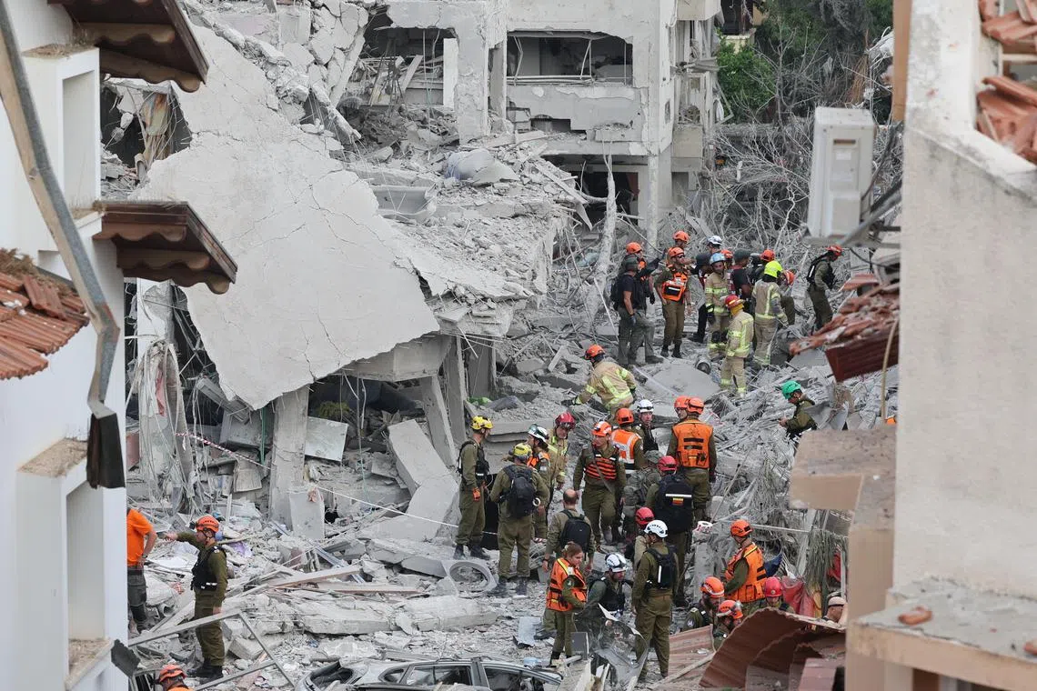 Pasukan penyelamat sedang menjalankan operasi pencarian dalam reruntuhan bangunan apartmen yang musnah di Rishon Lezion, sebuah bandar di luar Tel Aviv.