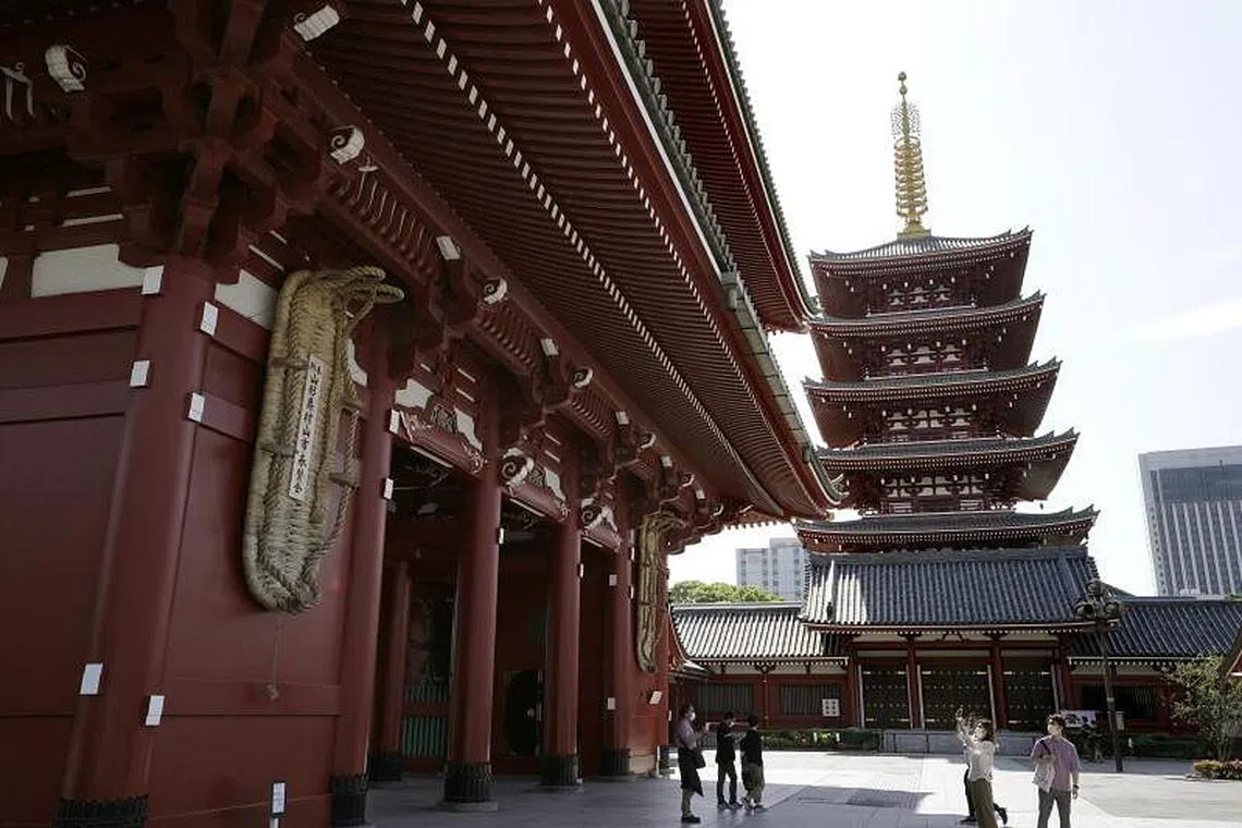 KESAN PENULARAN KORONAVIRUS: Jepun mengalami kemelesetan pertamanya sejak 2015, menurut data rasmi pada hari ini, dengan ekonomi ketiga terbesar di dunia menyusut 0,9 peratus pada suku pertama tahun ini. Kelihatan pengunjung melawat kuil Sensoji di Asakusa, Tokyo, Jepun, pada 17 Mei lalu semasa negara itu melaksanakan perintah darurat demi membendung penularan koronavirus. - - Foto: EPA-EFE