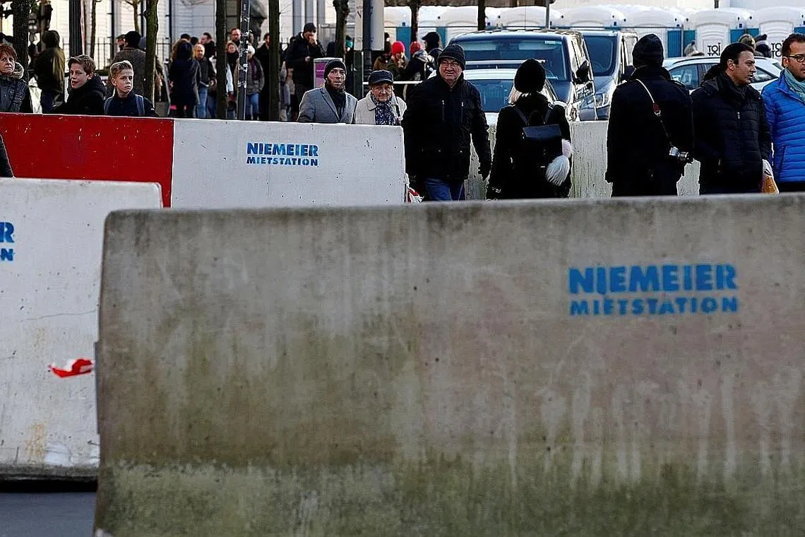 LANGKAH BERJAGA- JAGA: Blok-blok konkrit dipasang di Brandenburg Gate, Berlin, dan kenderaan berperisai diletakkan di pintu masuk zon sambutan Tahun Baru itu. - Foto REUTERS -