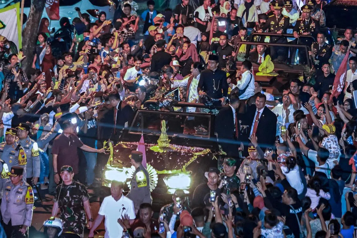 Encik Jokowi, yang menaiki kenderaan utiliti sukan (SUV) tanpa bumbung dan mengenakan pakaian tradisional Betawi yang dipakai ketika perasmian Encik Prabowo di Jakarta, melemparkan senyuman dan melambaikan tangan kepada orang ramai.