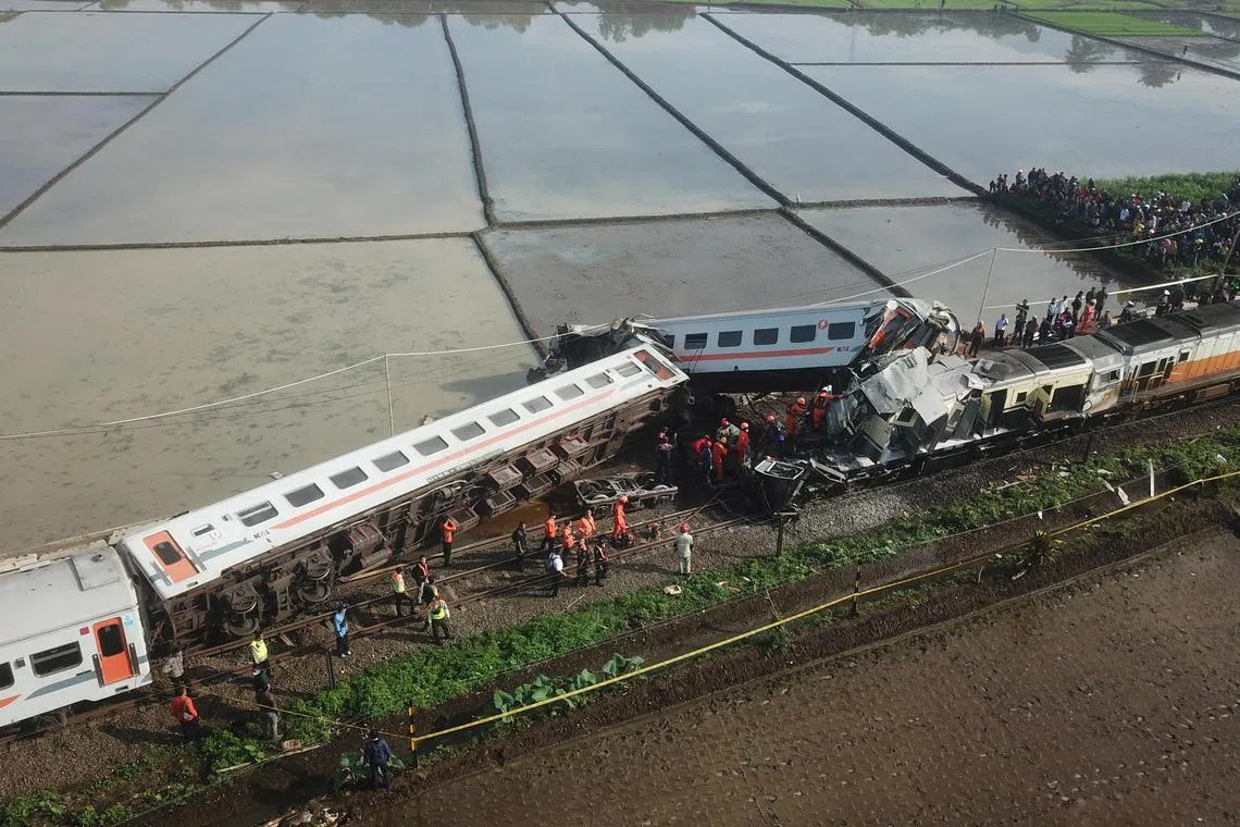 BANDUNG: Pasukan penyelamat di Indonesia berusaha menyelamatkan dua orang yang terperangkap di antara gerabak kereta api selepas kereta api penumpang bertembung di Jawa Barat pada 5 Januari, menyebabkan sekurang-kurangnya tiga kematian dan 28 orang cedera.