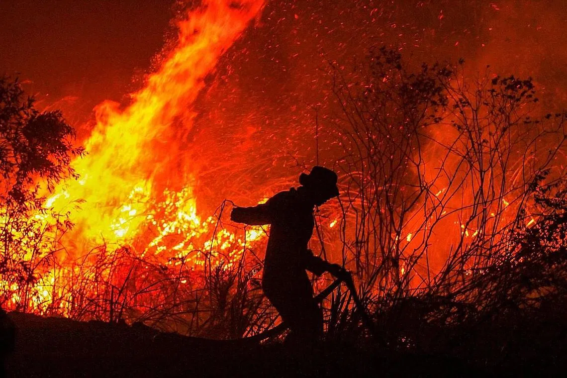 BERUSAHA PADAM API: Gambar fail menunjukkan seorang anggota bomba berusaha memadamkan api dalam satu kebakaran hutan di Kampung Rambutan Di Ogan Ilir di Sumatera Selatan September lalu. - Foto AFP -