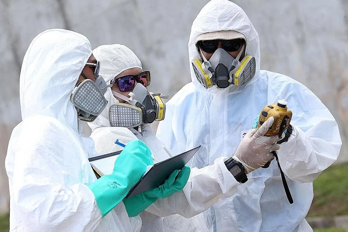 PASTIKAN PARAS SELAMAT: Pegawai kecemasan yang memakai pakaian perlindungan memeriksa mutu udara di Pasir Gudang kelmarin. - Foto AFP -