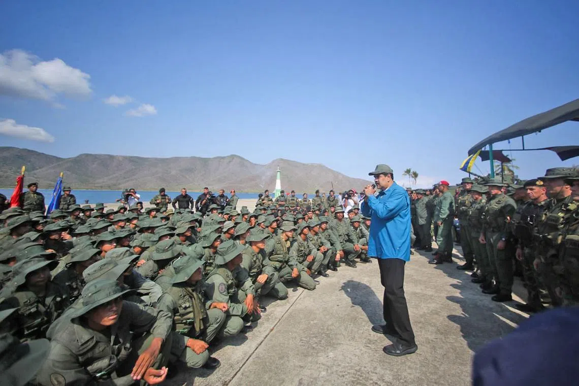 DEKATI PASUKAN TENTERA: Presiden Venezuela Nicolas Maduro menggalak tentera agar 'bersatu' dan 'setia' kepada angkatan di Turiamo, Venezuela, kelmarin. Berkenaan krisis di negara tersebut, Presiden Amerika Donald Trump menolak kepimpinan Encik Maduro. - Foto EPA-EFE -