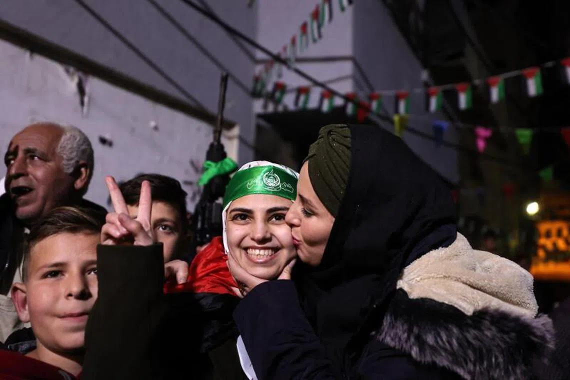 Orang ramai yang berhimpun di Tebing Barat bersorak dan mengibarkan bendera Palestin dan Hamas, bersama-sama dengan selendang kaffiyeh, selepas dua koc putih, diiringi kenderaan berperisai, keluar dari kem tentera Ofer bersama tahanan.