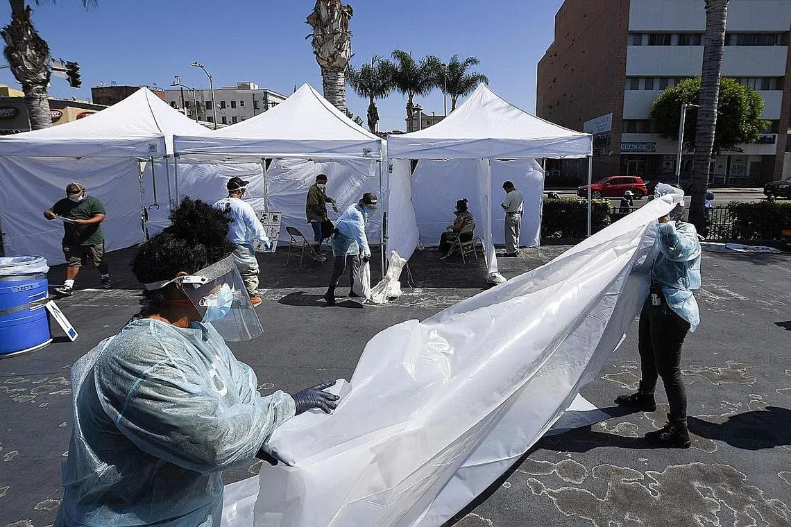 USAHA MENGESAN JANGKITAN: Kakitangan mendirikan sesekat bagi khemah kubikel di sebuah pusat ujian coronavirus Covid-19 di Los Angeles, California, kelmarin. Pegawai Los Angeles County melaporkan 1,920 kes baru Covid-19 kelmarin. Amerika mempunyai kes jangkitan Covid-19 tertinggi di dunia. - Foto AFP -