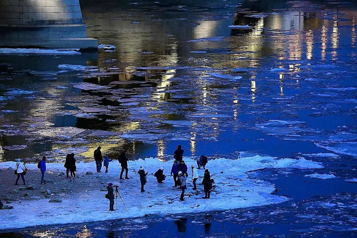SEMUA BEKU: Orang ramai mengambil gambar dan berdiri di atas kepingan ais yang membeku di Sungai Danube di Budapest, kelmarin. - Foto AFP -