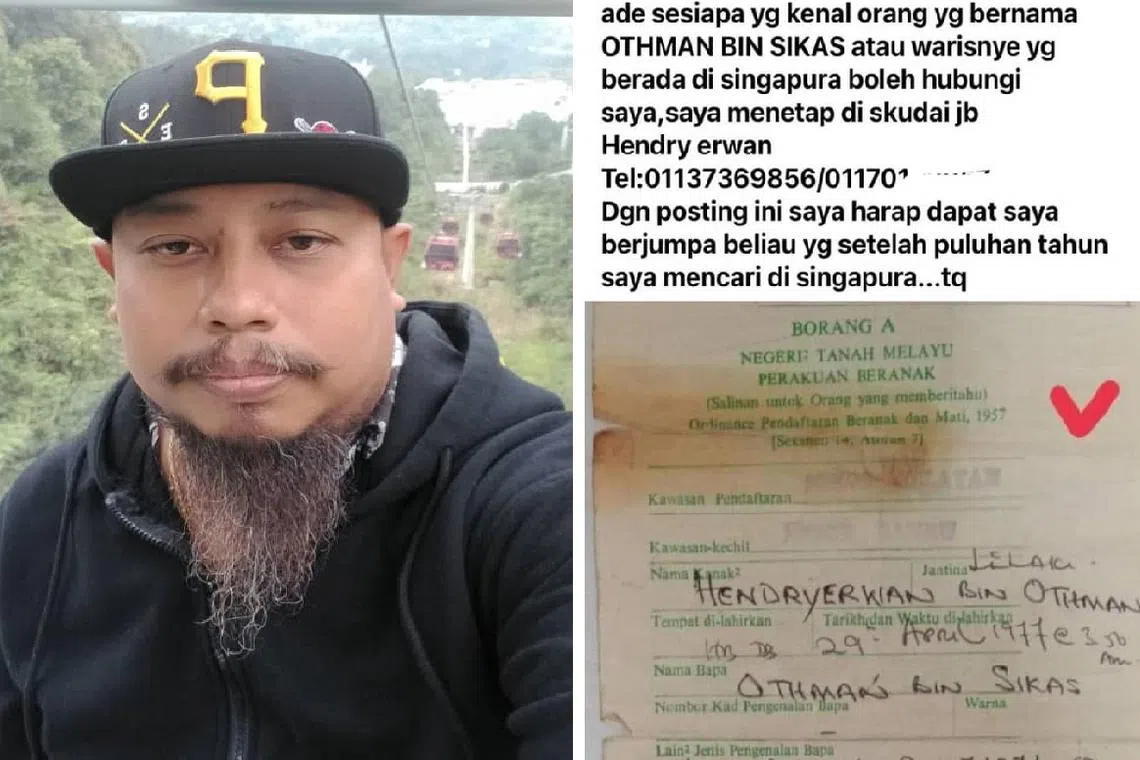 “Saya mencari bapa kandung saya yang tidak pernah saya jumpa selama 47 tahun. Kalau ada sesiapa kenal orang bernama Othman Bin Sikas atau warisnya yang berada di Singapura boleh hubungi saya,” tulis Encik Hendry dalam catatan itu.