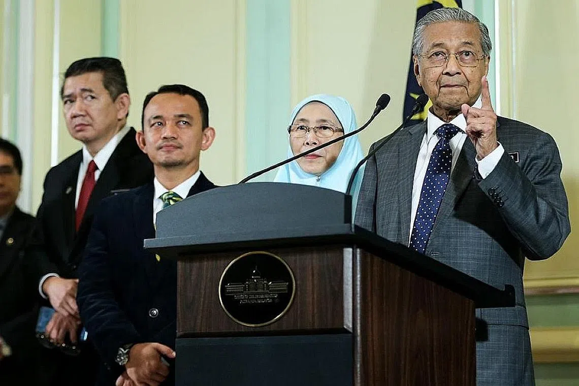 KAJI SEMULA PERJANJIAN: Dr Mahathir (kanan sekali) mengumumkan akan mengkaji semula perjanjian dagangan pasaran saham dengan Singapura. Di sebelahnya ialah Timbalan Perdana Menteri, Datuk Seri Dr Wan Azizah Wan Ismail. Turut hadir ialah Menteri Pelajaran, Dr Maszlee Malik dan Menteri Pertanian dan Industri Asas Tani, Encik Salahuddin Ayub (kiri sekali). - Foto MALAY MAIL -