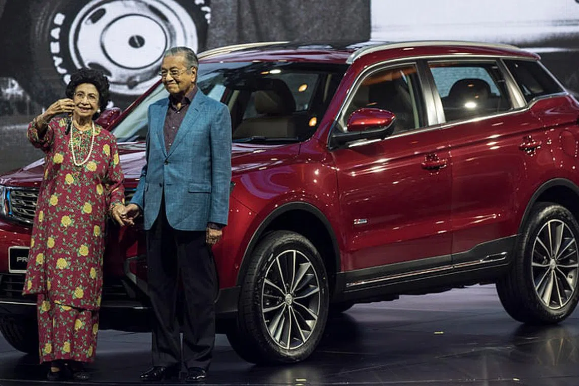 HARAP JADI KEBANGGAAN NEGARA: Dr Mahathir dan isteri Tun Dr Siti Hasmah bergambar di hadapan kereta jenis SUV, X70, yang dihasilkan menyusuli kerja sama Proton dan syarikat automotif dari China, Geely. - Foto EPA-EFE -