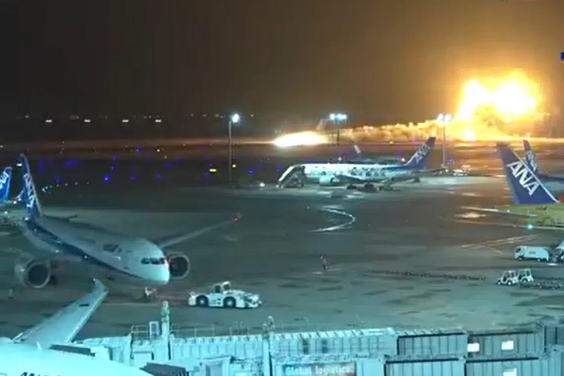 Rakaman daripada kejadian yang berlaku di lapangan terbang Haneda di Tokyo menunjukkan api tiba-tiba merebak pada kapal terbang jenis Airbus A350 Japan Airlines sebelum ia tergelincir di landasan.
