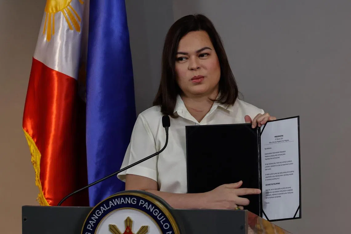 Dewan Rakyat telah memecat Cik Duterte pada 5 Februari atas tuduhan termasuk penyalahgunaan bajet, pengumpulan kekayaan luar biasa, serta dakwaan ancaman terhadap nyawa Presiden Ferdinand Marcos Jr, Wanita Pertama dan Speaker Dewan.