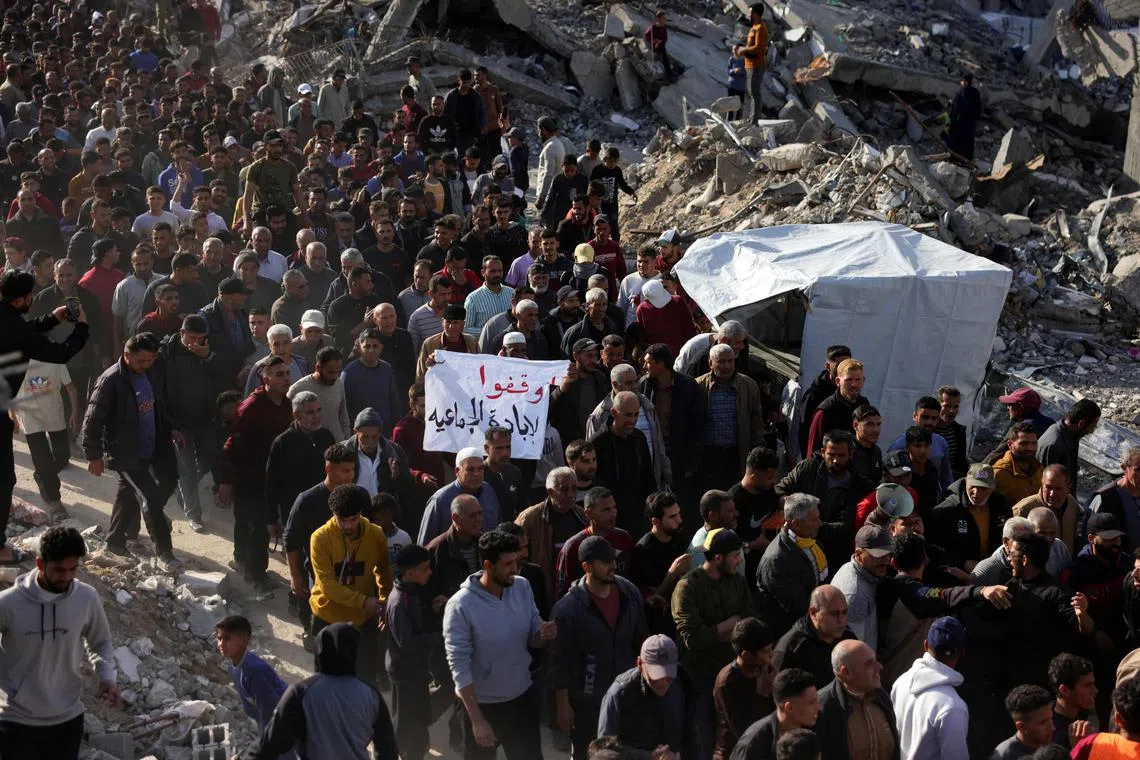 Dalam satu perkembangan lain, beribu-ribu rakyat Palestin berarak melalui runtuhan sebuah bandar yang musnah di utara Gaza pada 26 Mac, menandakan hari kedua protes anti-perang.