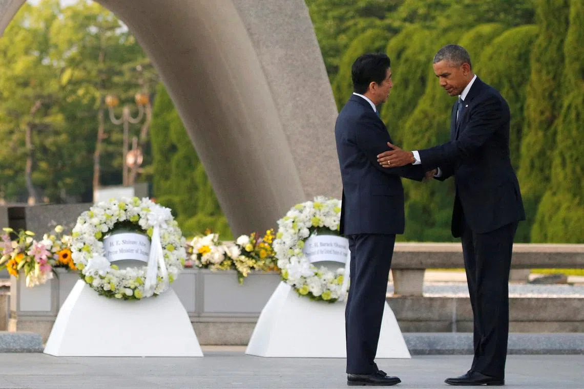 Encik Obama disambut Perdana Menteri Jepun, Encik Shinzo Abe, di Taman Peringatan Keamanan Hiroshima di mana beliau meletakkan kalungan bunga di tugu bagi mangsa serangan bom atom pada 1945.