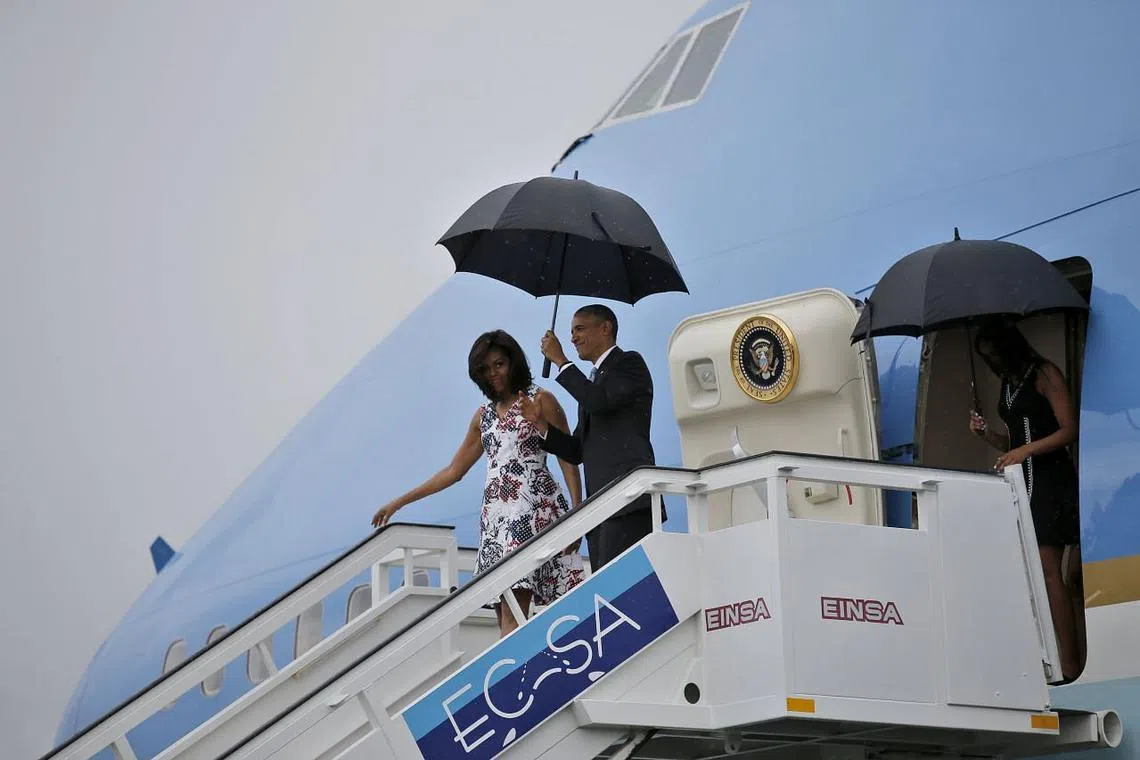Encik Obama mendarat di Lapangan Terbang Antarabangsa Jose Marti Havana menaiki pesawat Air Force One, jet presiden yang tertera terpampang 'United States of America' di seluruh badan pesawat itu - pemandangan yang hampir tidak dapat dibayangkan sebelum pengenduran ketegangan pada Disember 2014.