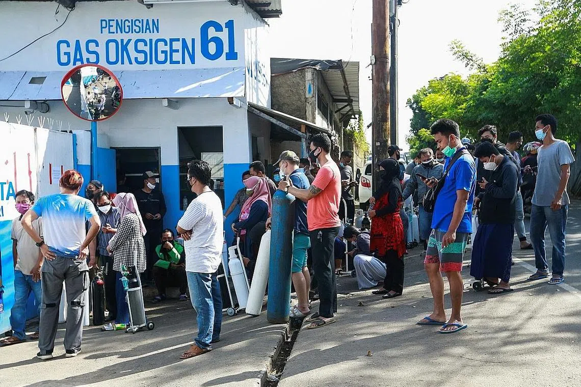 JAKARTA: Orang ramai, kebanyakannya memakai pelitup dan ada membawa silinder oksigen, berdiri di luar sebuah kilang di ibu kota Indonesia ini untuk membeli oksigen semalam.