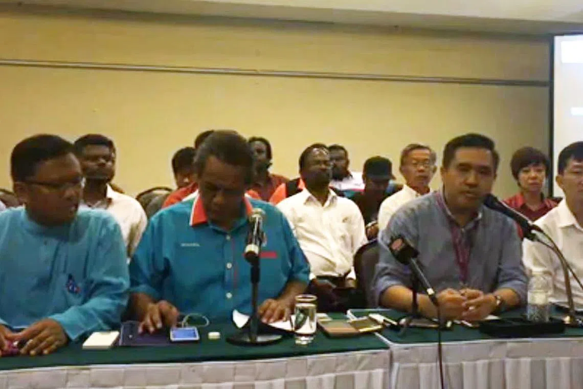 UMUM KEMENANGAN: Pengerusi Harapan negeri, Encik Aminuddin Harun (dua dari kiri) berkata setakat ini mereka menang di 19 kerusi - 11 disumbangkan DAP, lima dari PKR dan tiga (AMANAH). - Foto FACEBOOK -
